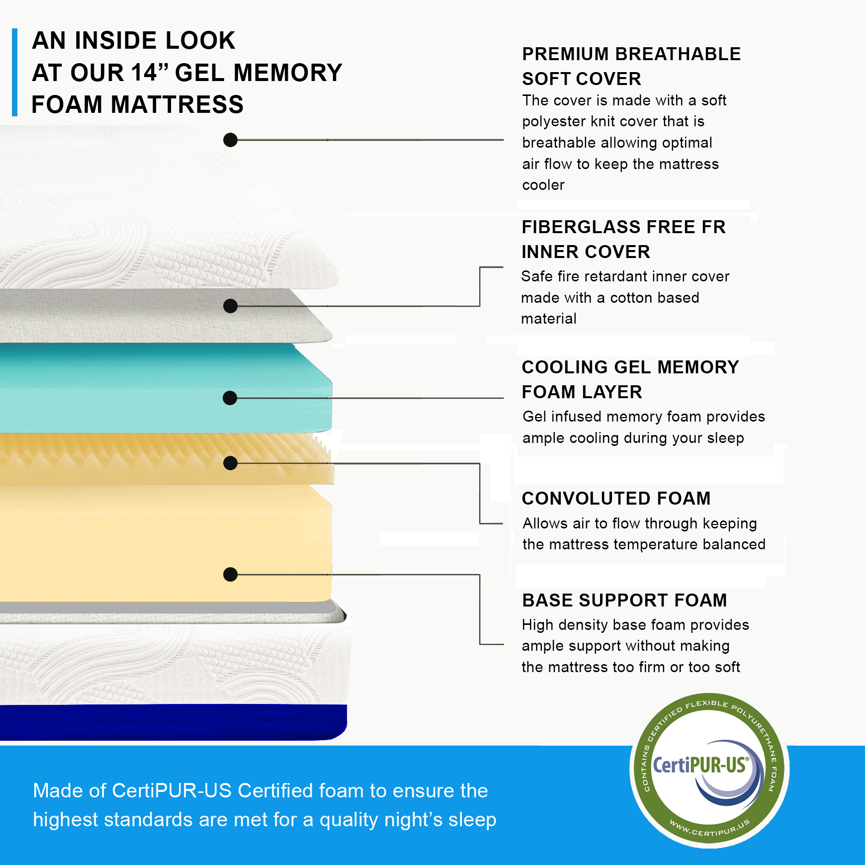 CertiPUR-US CERTIFIED – CertiPUR-US certified mattresses are made with safe materials.