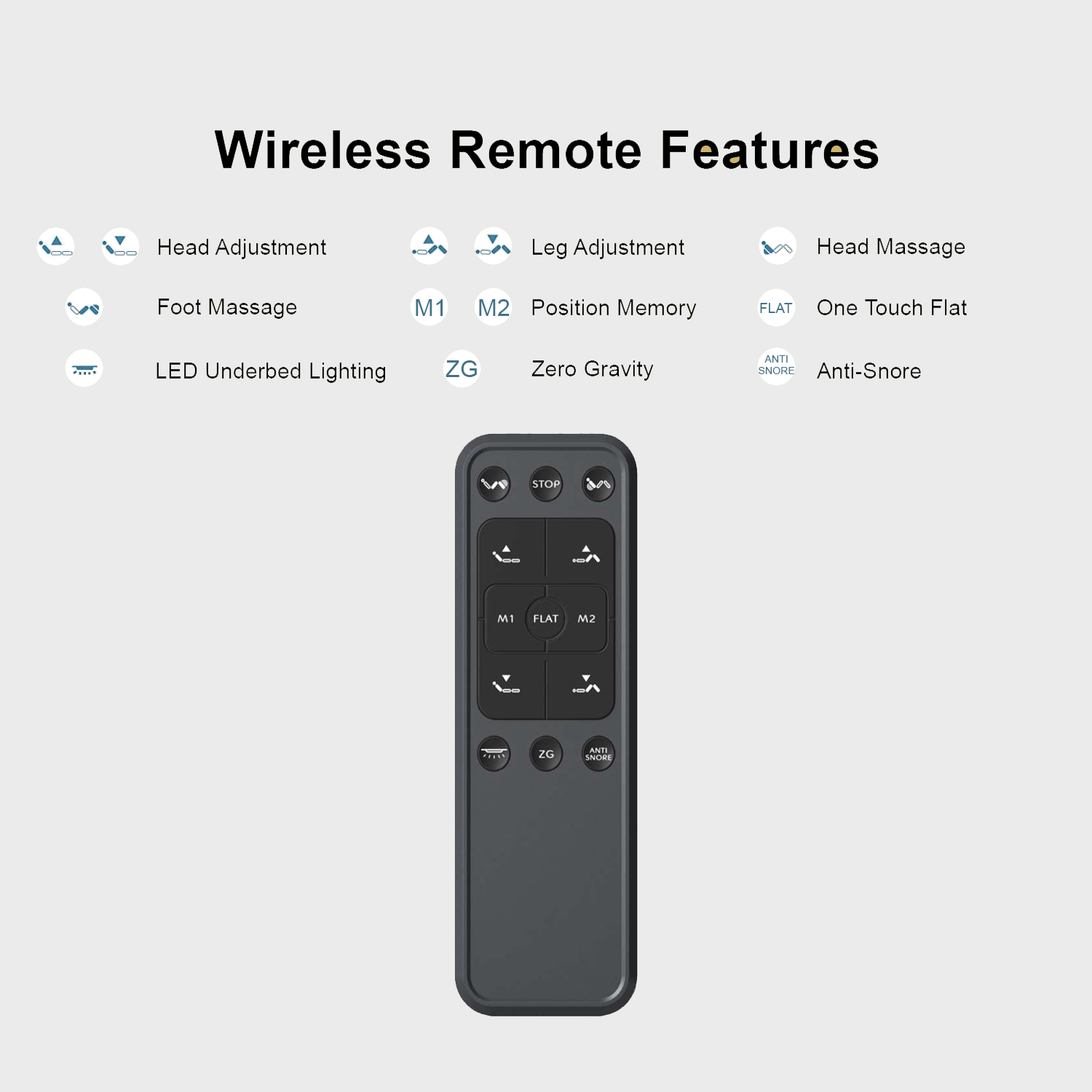 Loaded Features: Zero Gravity, Anti-Snore, Programmable Memory Positions, Full Body Massage, USB, Under Bed Lighting, Remote Flashlight.